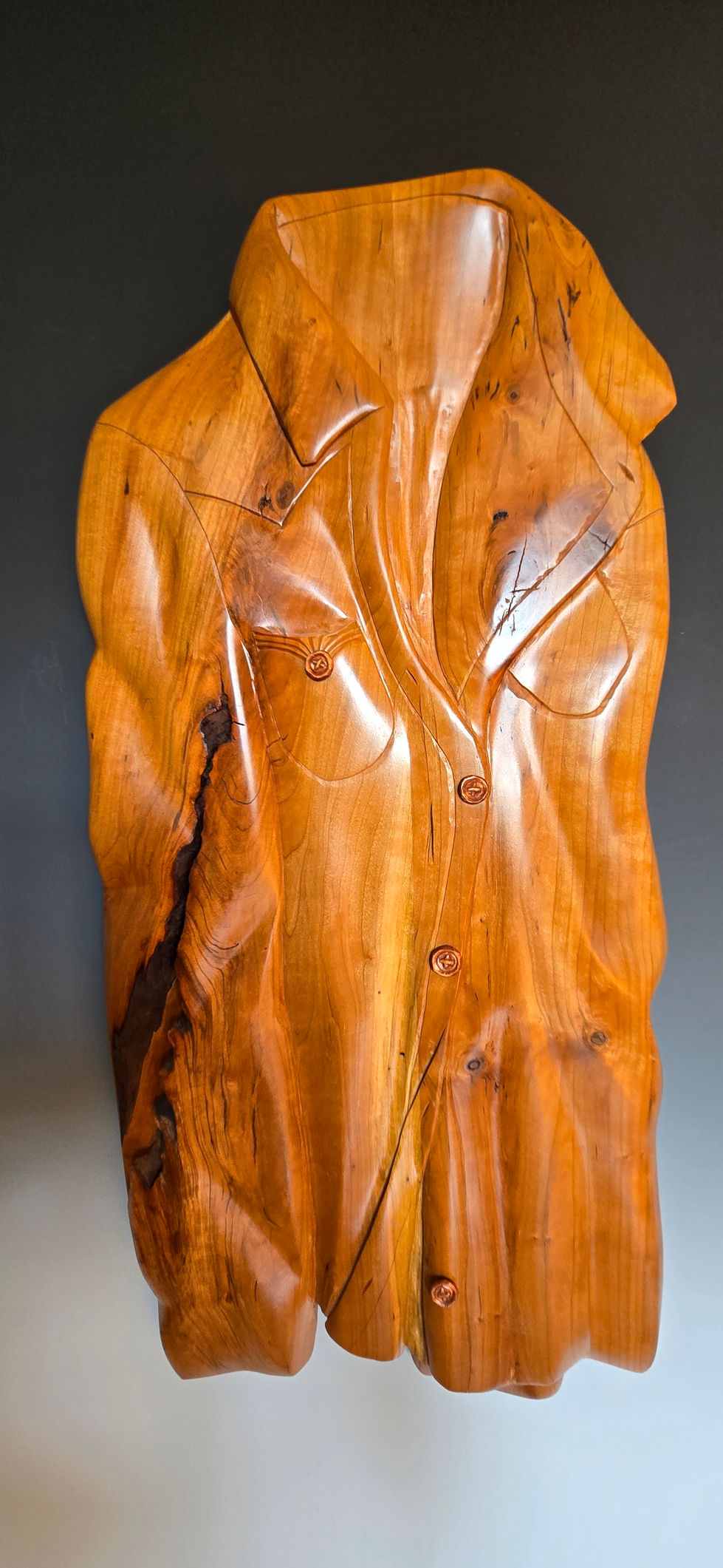 Utilizing natural distress and grain defects to create a worn effect on a western shirt. Hand carved in Cherry. $2,000.00